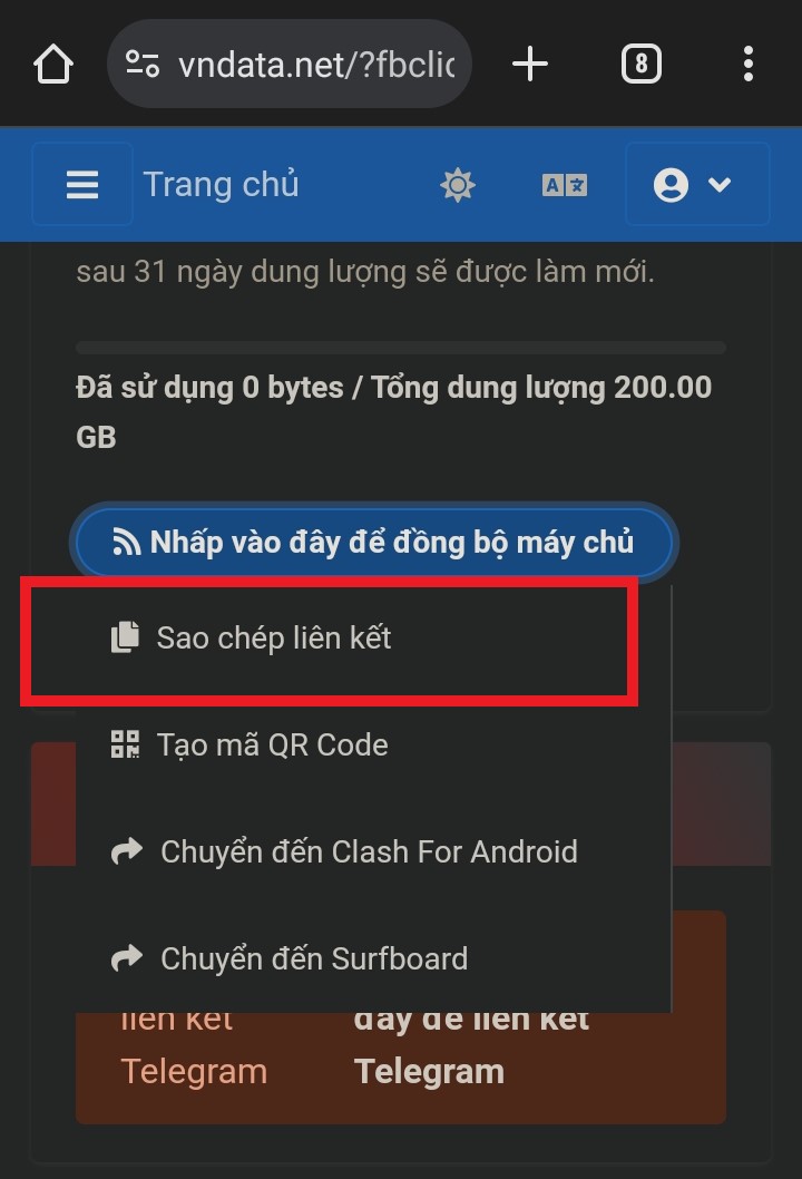 Sau khi đăng ký gói ở vndata.net, bạn vào Trang chủ bấm dòng “Đồng Bộ Máy Chủ” chọn “Chuyển đến V2rayNG”