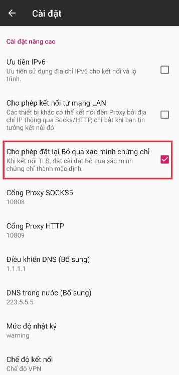 Dòng “Cho phép đặt lại Bỏ qua xác minh chứng chỉ” bật tích lên